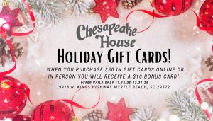 Welcome to the Chesapeake House! A Myrtle Beach family seafood tradition since 1971. Family owned and operated for over 55 years, The Chesapeake House has a long history of serving up fresh local seafood and USDA steaks that has kept guests and locals coming back year after year. From our scenic waterfront views, homemade salad dressings, Uncle Bill’s famous fish stew, and our world famous cinnamon rolls made fresh daily in our bakery, your evening will be one to remember. Visit the original “Restaurant Row” restaurant and discover what makes a landmark…a landmark.