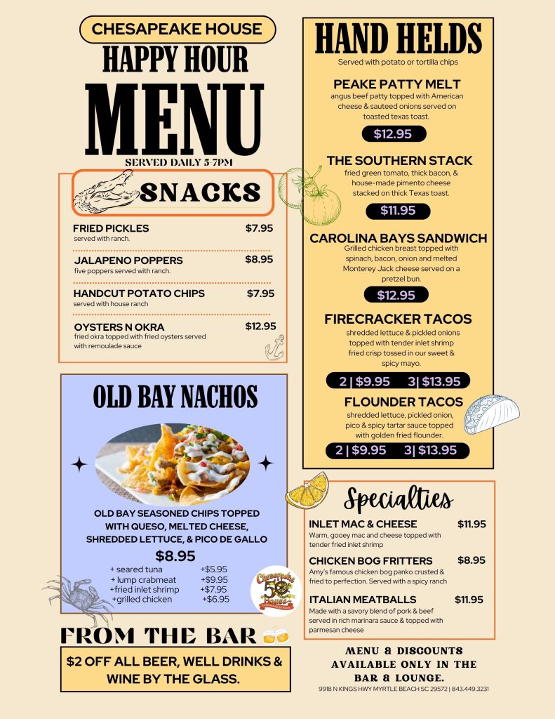 Chesapeake House is a Myrtle Beach seafood restaurant located near the Tanger Outlets on Highway 17 along the Grand Strand. Chesapeake House is open daily for dinner. from 4:30 until 10 pm. The dinner menu consists of fresh shrimp, flounder, salmon, soft shell crab, clams, oysters, scallops, lobster, crab cakes, Alaskan King Crab legs, chicken, ribeye steak, New York strip steak, ribeye steak, spaghetti, soups, salads, desserts and much more. Chesapeake House is located at 9918 Highway 17 North in Myrtle Beach, South Carolina.
